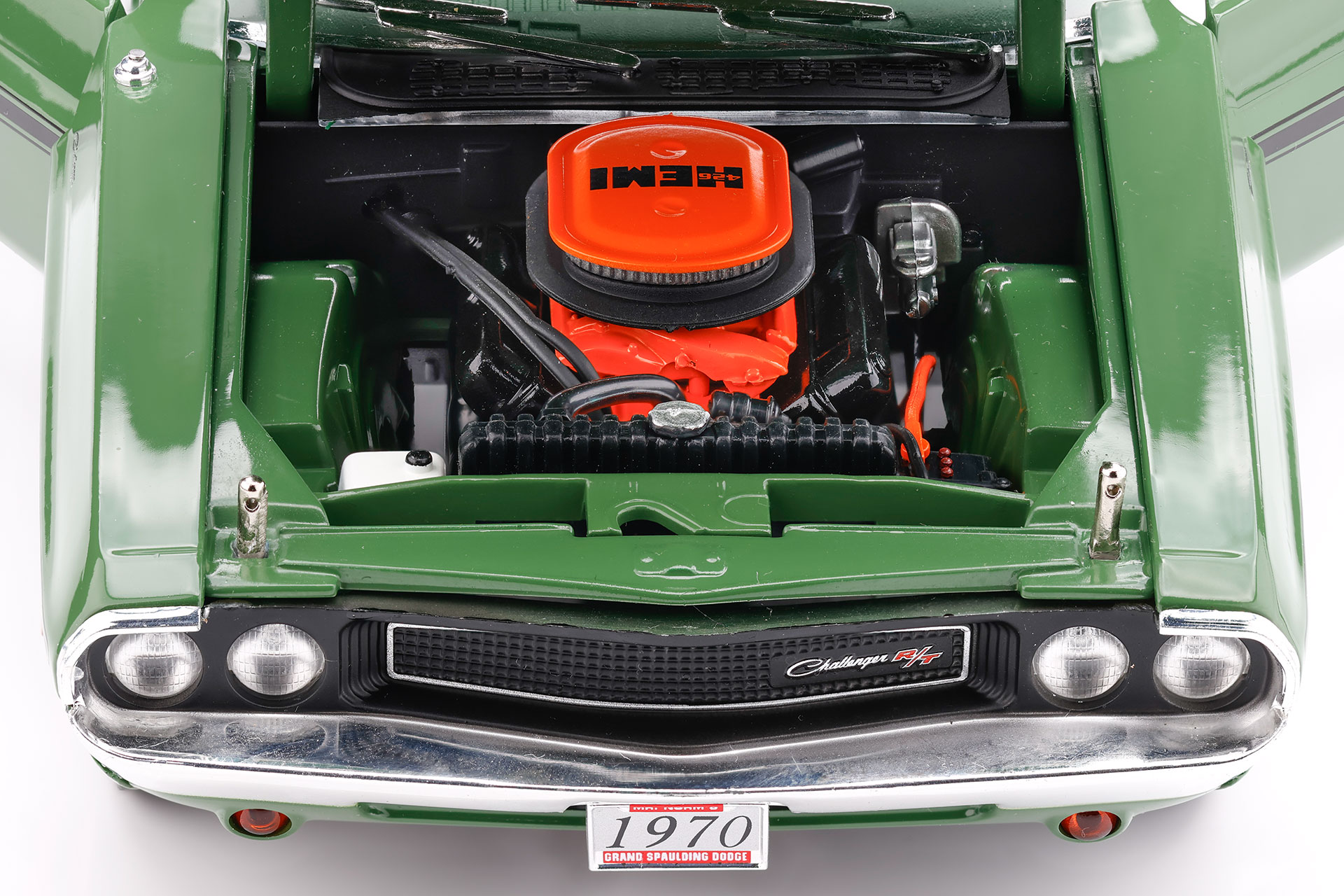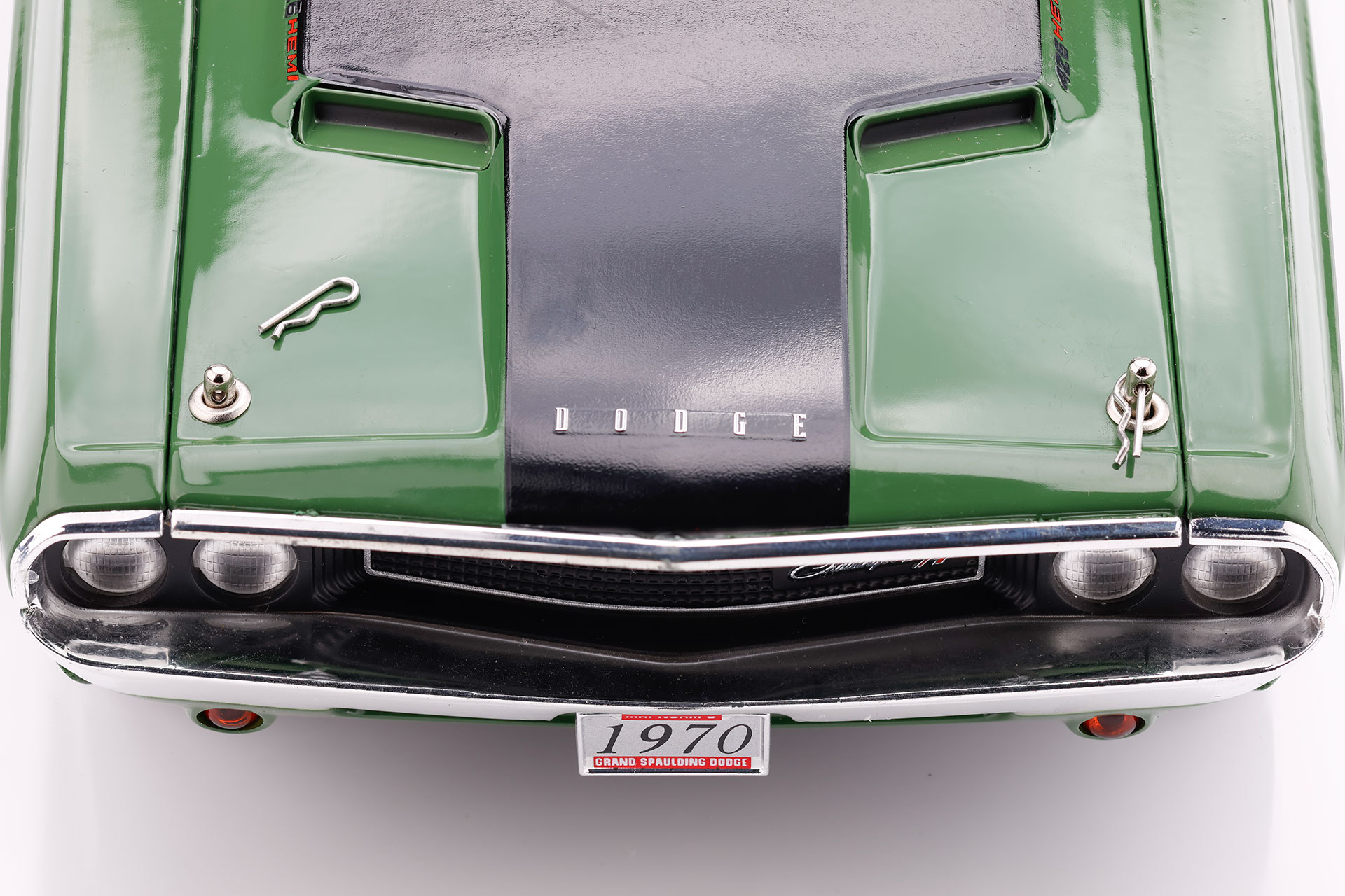 Érdekes és viszonylag ritka megoldás, hogy a modell motorháztetejét külső hood pin rögzíti. Ez modellautóknál nem számít általánosnak, a GreenLight ebben az esetben egy kifejezetten karakteres, látványos részletet alkalmazott. A motorháztető csak a rögzítő tűk eltávolítása után nyitható, más megoldás nincs.