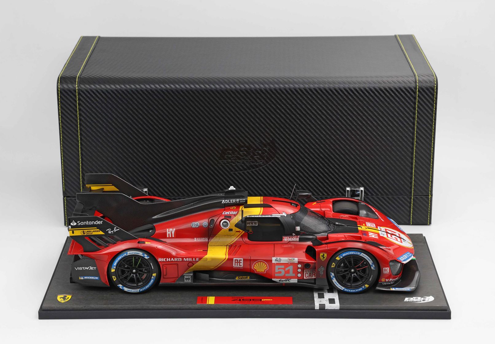 A modell a Le Mans-i 24 órás célba érkezést megidéző talapzaton kerül értékesítésre, kézzel készített, tiszta plexi vitrinnel, valamint egyedi dobozolással – egy valódi gyűjtői darabhoz méltó kivitelben.
