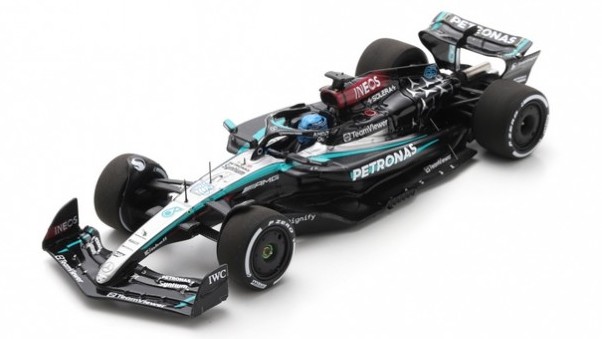 Mercedes F1 W14 n.63 2023 G. Russell vitrinnel és pilótával